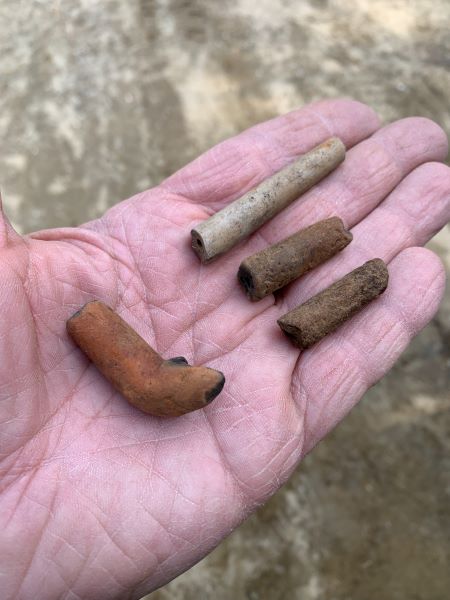 በጣቢያው ላይ ያገኘነው ቀጣዩ የቅርስ ክፍል ከትንባሆ ማጨስ ጋር የተያያዘ ነው። በውሃ መስመር ላይ, በትንሽ የአሸዋ ዝርጋታ እና ከሴራሚክ ቁርጥራጮች ጋር በመደባለቅ, አራት የትንባሆ ቧንቧ ቁርጥራጮችን አገኘሁ. ከመካከላቸው አንዱ የቧንቧ ጎድጓዳ ሳህን ክፍልን ያካትታል. የሚገርመው ነገር አራቱም በአካባቢው ከሸክላ የተሠሩ ናቸው። ሦስቱ በአጻጻፍ ስልቱ ብዙውን ጊዜ ከአገሬው ተወላጅ አሜሪካዊ የቧንቧ ማምረት ጋር የተቆራኙ፣ ከአካባቢው ቀይ ሸክላዎች የተሠሩ እና የኮርስ አጨራረስ። አንዱ ደግሞ የVirginia ሸክላ ነበር፣ ነገር ግን ቀለል ያለ ስሪት፣ ባነሰ ጥራጥሬ እና የተቃጠለ አጨራረስ። ይህ በጄምስ ወንዝ ዳርቻ በሰሪዎች የተሰሩ ቱቦዎችን ይመስላል።