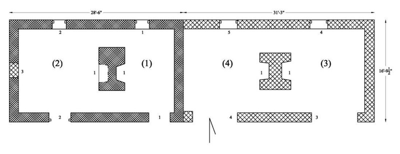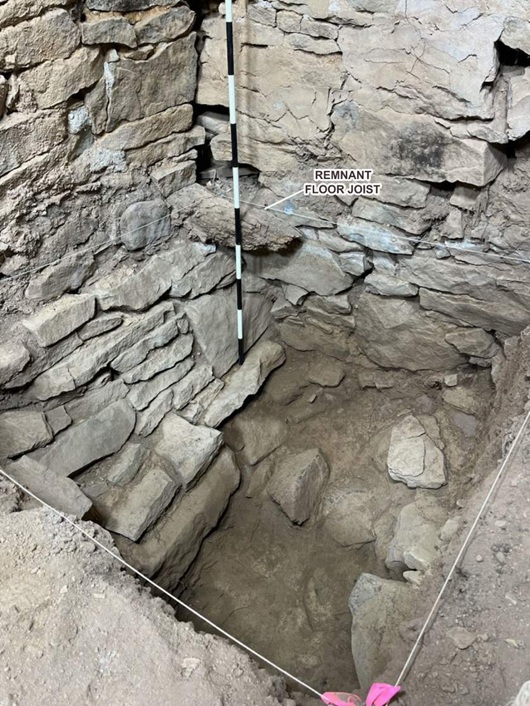 በህንፃው ውስጥም ሆነ ከህንፃው ውጭ የተደረጉ ቁፋሮዎች የድንጋይ መሠረቱን፣ የመጀመሪያዎቹን የተነሱ የእንጨት ወለሎችን (መገጣጠሚያዎች፣ ክሊቶች፣ የወደቁ ሰሌዳዎች) እና የህንፃውን ግንባታ እና በኋላ ላይ የተደረጉ ለውጦችን የሚያብራሩ በርካታ የመሠረት ባህሪያትን መዝግበዋል። የተቃጠለ ወይም የጥፋት ማስረጃዎች አንዳንድ አውዶችን ይሞላሉ፣ ከውስጥ ክፍሎች ውስጥ ከተደባለቁ የስትራቲግራፊክ ክምችቶች ጋር፣ በ 19እና 20መጀመሪያ ክፍለ ዘመናት ውስጥ ውስብስብ የመፍጠር ሂደቶችን - ጥገና፣ መፈራረስ እና እንደገና ጥቅም ላይ ማዋል - ያመለክታሉ (ሂጊንስ እና ሌሎች 2025)።