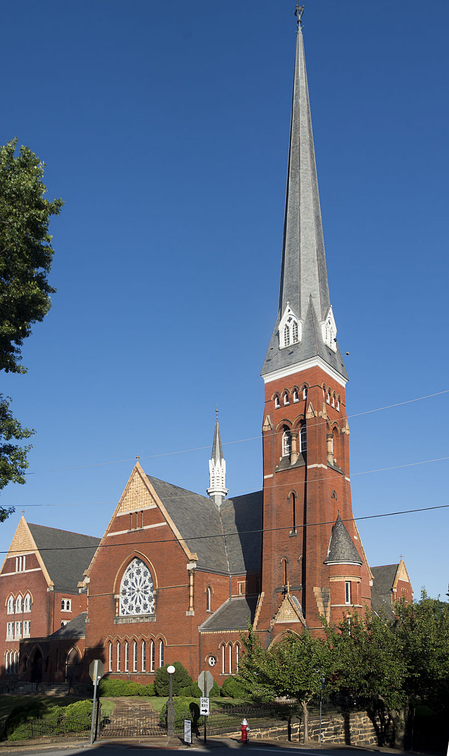 ይህ ኃይለኛ ድርሰት፣ በውስጡ ብዙ ጋቦሎች በመርፌ ስፒር ጎልተው የሚታዩት፣ ምናልባት የቨርጂኒያ የከፍተኛ የቪክቶሪያ ጎቲክ ዘይቤ ምርጥ ተወካይ ሊሆን ይችላል፣ በጆን ራስኪን ጽሑፎች አነሳሽነት የጎቲክ ሁነታን ያጌጠ የበለፀገ ትርጓሜ ነው። የሊንችበርግ የመጀመሪያ ባፕቲስት ቤተክርስትያን አርክቴክት የሆነው ጆን አር ቶማስም በቨርጂኒያ ዩኒቨርስቲ ታዋቂ የሆነውን ብሩክስ አዳራሽ ዲዛይን አድርጓል። የቤተክርስቲያኑ ግንባታ የተጀመረው በ 1884; በ 1928 በስታንሆፕ ጆንሰን የተነደፈው በሥነ ሕንፃ ተኳሃኝ የሆነው የሰንበት ትምህርት ቤት ክንፍ ታክሏል። የሕንፃው ድምቀቶች አንዱ የበለፀገ ቀለም ያለው፣ በአገር ውስጥ የሚመረተው፣ በቪክቶሪያ የተቀባ መስታወት ነው። ጥሩ የሚሰራ እና ተደማጭነት ላለው ጉባኤ ተልእኮ ተሰጥቶት ቤተክርስቲያኑ በሊንችበርግ የዕድገት እና የብልጽግና ዘመን ውጤት ነበረች። በ 1993 አውሎ ንፋስ ወቅት አከርካሪው ወድቋል ነገር ግን ከዚያ ወዲህ እንደገና ተገንብቷል። የፈርስት ባፕቲስት ቤተክርስቲያን በፍርድ ቤት ሂል/ዳውንታውን ታሪካዊ ዲስትሪክት ውስጥ ትልቅ ቦታ ያለው ምልክት ነው።